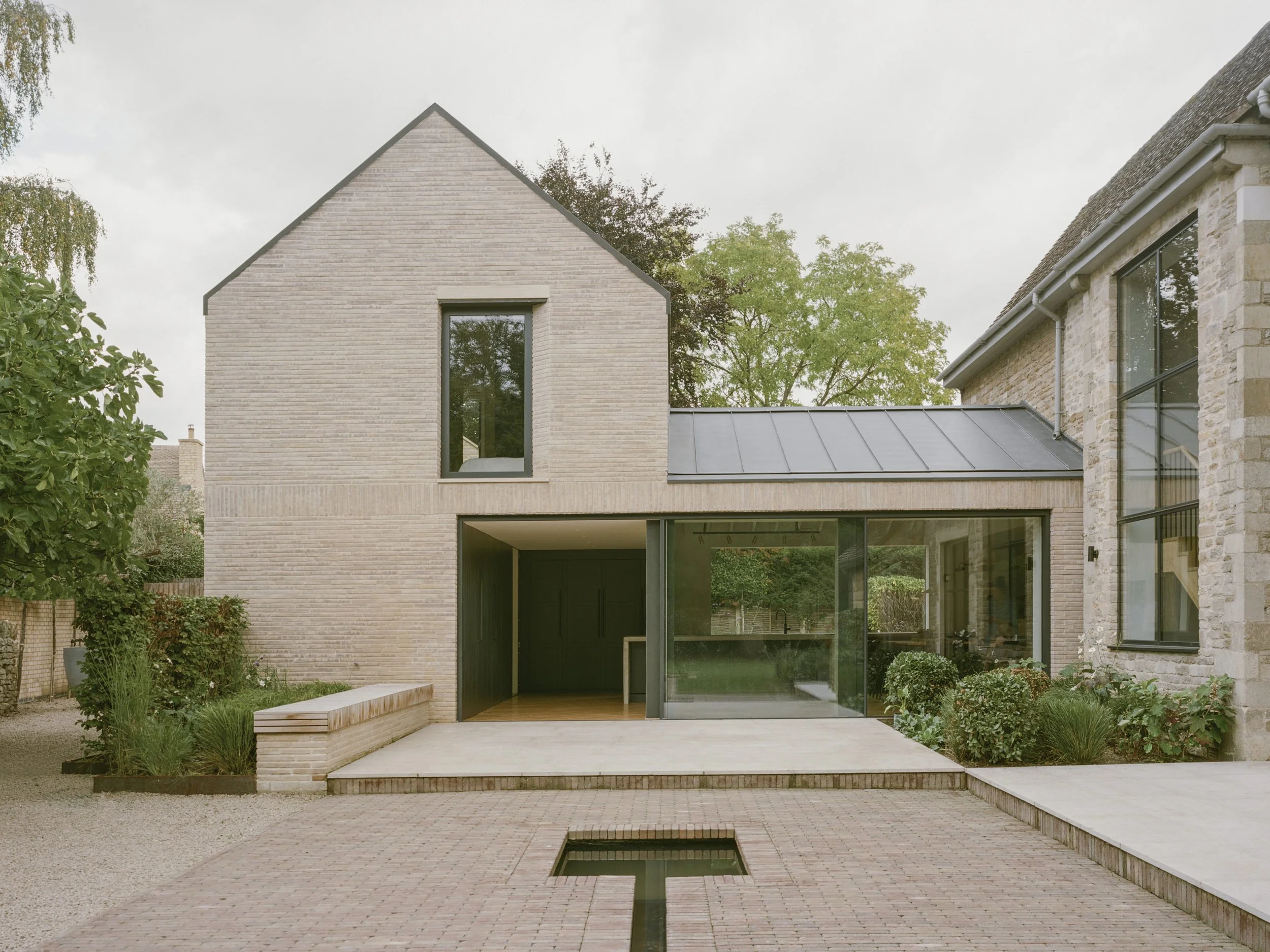 The first phase of Follyfield’s revival sees the addition of three gabled extensions in varying scales which respond to the proportions of the existing property, blending contemporary architecture with the hamlet’s rural vernacular. The largest extension is built from clay bricks to complement the existing stone of the property, connected to the main house by a zinc-clad gabled kitchen and living space. The third addition is a new garage built from reclaimed stone and pale timber.