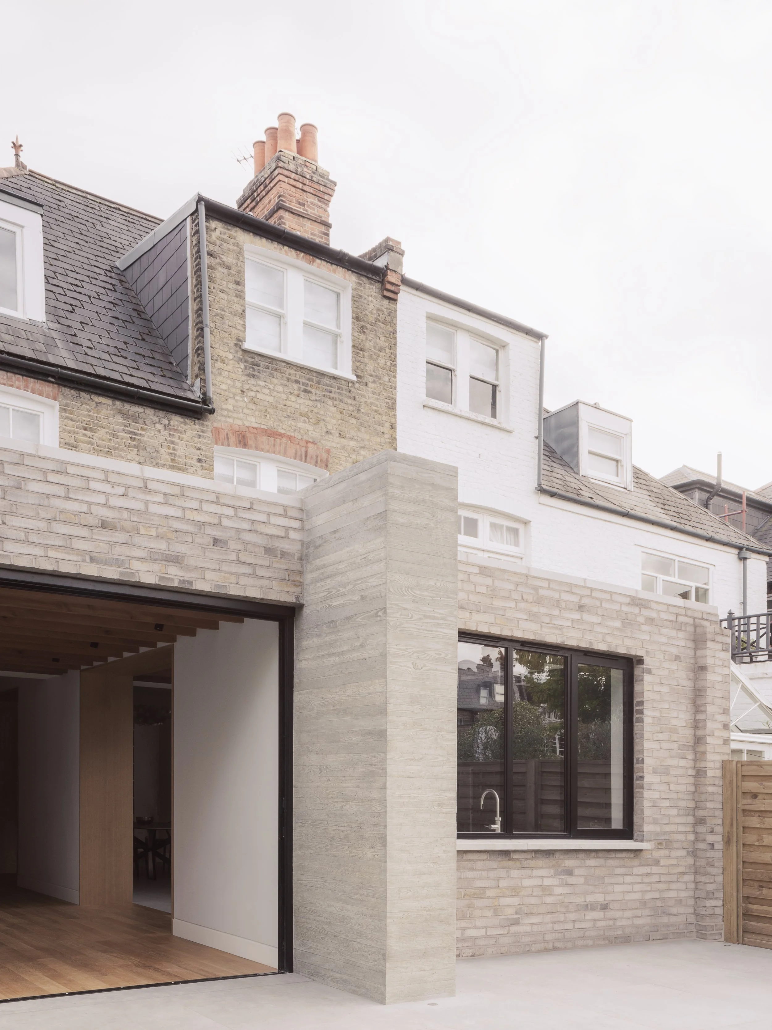 A visually heavy in-situ cast concrete column, acts as an anchor for the axis and the centre of the rear facade. Either side of the column the extension can be read as two volumes, both built in pale grey brick with pale grey mortar to give a monolithic appearance to contrast the existing property. Subtle detailing, such as turning the brick on edge, references the height of the internal oak exposed ceiling joists. The sawn timber shuttering used to texture the concrete façade matches the height of the pale brick, along with the concrete sills and coping.